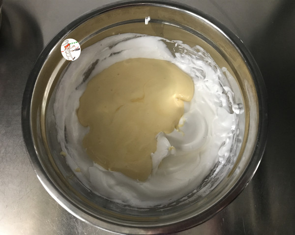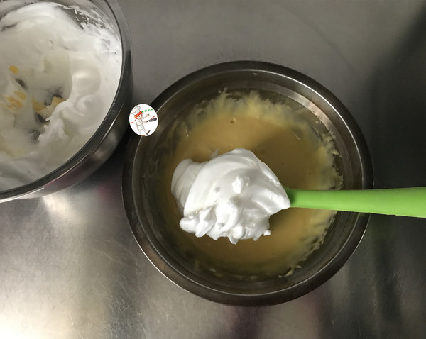 9.Take 1/3 meringue, put it into the egg yolk paste, and use a spatula to quickly mix it evenly