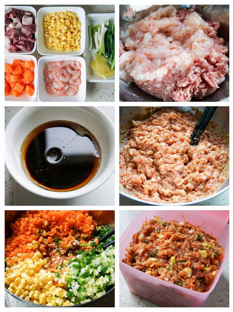 📝Filling: (🉑48 dumplings) 300g pork|100g fresh shrimp|30g shallot|10g ginger|100g sweet corn|100g carrot|20g soy sauce|10g cooking wine|20g oyster sauce| 10 grams of sesame oil|20 grams of edible oil|3 grams of salt|3 grams of sugar|3 grams of chicken stock powder|1 gram of white pepper powder