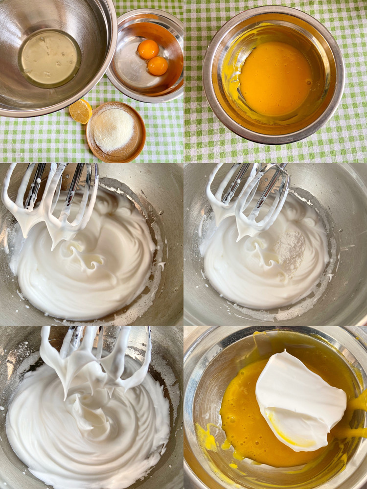 - Take one-third of the meringue and put it into the egg yolk, mix it evenly and pour it back into the remaining egg white, mix it again or cut it in half evenly, do not draw circles, it is easy to defoam!